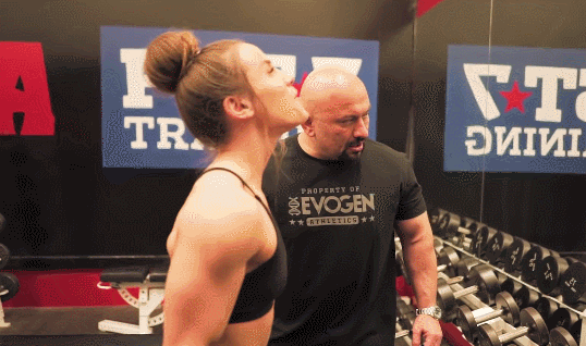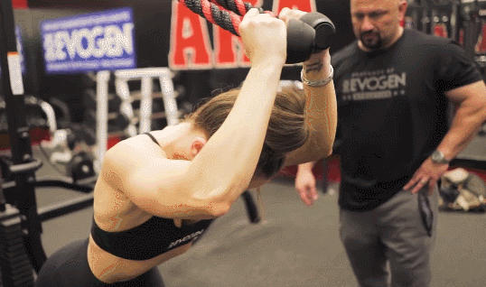 這個動作同樣使用龍門架和繩索進行訓練,2.5KG的重量配合背向俯身的動作,將繩索放在腦后,由后至前進行臂屈伸拉動。